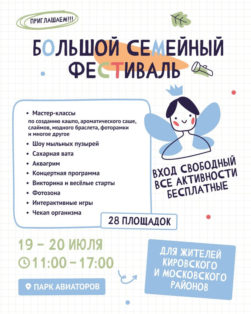 Большой семейный фестиваль уже в эти выходные! Праздник будет идти 19 и 20 июля с 11:00 до 17:00 в парке Авиаторов — для нас и наших соседей из Московского района.